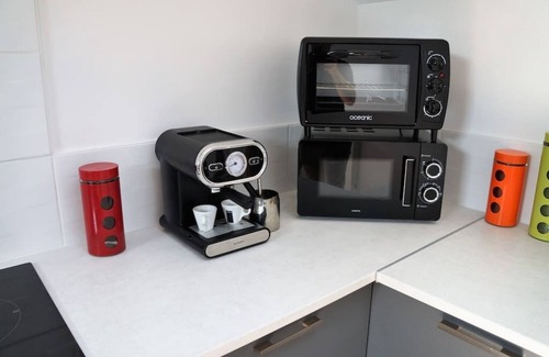 La cuisine est totalement équipée, un mixer plongeant, machine à café expresso haute pression avec sa buse à mousse de lait, une bouilloire, un grille-pain, une micro-onde, un four...