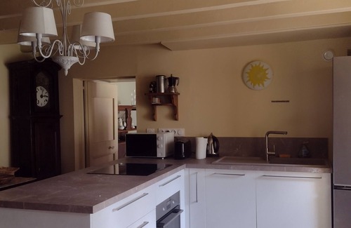 Rénovée récemment, elle bénéficie d'un espace repas avec cuisine équipée, d'un salon, de deux chambres avec 1 lit double, un berceau et deux lits d'une personne.