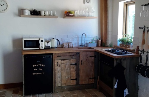 Situé à côté d'un petit étang à canards, surplombant la cour de ferme / les anciennes écuries / etc. ainsi que l'église locale, The Dovecote est un bâtiment à deux étages à ossature de briques et de chêne fini à un niveau incroyablement élevé. Paisible et isolé avec sa propre cour, le pigeonnier a un emplacement élevé dans la cour autrement non développée.