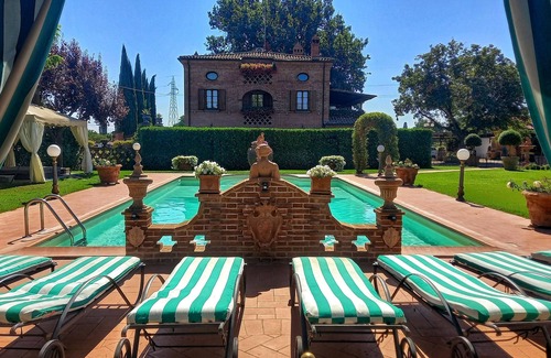 Dans le prolongement de la villa se trouve la belle piscine (6x12 mètres) avec escalier romain et fontaine ouverte en haute et moyenne saison de chaque année et le porche d'origine en bois et briques. D'un côté de la piscine se trouve un grand bain à remous extérieur (SPA) de 6 places dont une allongée avec chauffage, ozonateur, cascade et hydromassage à 2 vitesses et 32 jets. L'utilisation du chauffage rend la piscine utilisable même en basse et moyenne saison, complétant le programme de bien-être avec un sauna finlandais (calidarium) de 8 places avec antisauna (tepidarium) qui a une température moyenne entre l'extérieur et l'intérieur du sauna.