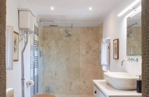 Upstairs, there are four double bedrooms in this luxury Tuscany villa, all equipped with air conditioning and boasting ensuite bathrooms decorated with travertine tiles, stone sinks and high quality fittings. One also has a free standing bath tub, perfect for a long soak after a days sightseeing.