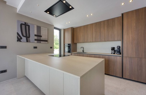Recently built, the house exudes airiness and style. Large glass walls connect the interior and exterior, and design elements such as the angular stone facade and warm wooden accents create a sophisticated yet homely atmosphere.
