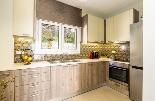 Entering the villa on the first floor the guests find themselves in a spacious open plan area decorated with great care and elegant taste consisting of the air conditioned living room and a fully equipped kitchen. The living room features a large sofa, satellite 40 HDTV with Netflix and a dining area. From the living room large glass doors open onto a balcony with an outdoor table offering mountain and sea views. Next to the living room there is a fully equipped kitchen with top quality fixtures and appliances. Additionally, a WC, a storage room and a laundry room with washing machine are available on the ground floor.