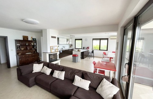 A l'étage il y a une chambre principale avec salle de douche attenante. Il s'ouvre sur une grande terrasse offrant une vue panoramique sur la mer. Il y a une autre chambre double avec grande terrasse et une chambre double supplémentaire avec balcon et une chambre simple. Deux des chambres doubles ont des lits simples supplémentaires.
