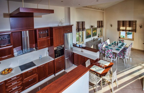 Un escalier de marbre ouvert (huit marches) mène à l'étage supérieur où se trouve une cuisine très bien équipée avec cuisinière électrique, four électrique, four à micro-ondes, lave-vaisselle, réfrigérateur / congélateur, cafetière, grille-pain, presse-agrumes et bouilloire électrique. Dans le même niveau de la cuisine il y a la salle à manger avec une grande table à manger pour 12 personnes.