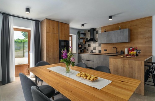 La charmante villa n° 8 se trouve au centre de l'Istrie, près de Pazin. Cette villa de deux étages est idéale pour les familles ou les couples qui souhaitent passer des vacances reposantes au cœur de la nature. La villa dispose en tout de 4 chambres à coucher et peut accueillir jusqu'à 9 personnes. L'élégance sobre s'étend de l'extérieur jusqu'aux chambres à coucher. Devant la villa, vous trouverez une piscine accueillante et ensoleillée dans laquelle vous pourrez vous rafraîchir lors des chaudes journées d'été. À l'extérieur, vous trouverez également un barbecue au charbon de bois sur lequel vous pourrez préparer de délicieux repas et les déguster en buvant un verre de la meilleure malvazija d'Istrie. Le rez-de-chaussée se compose d'un espace de vie moderne avec un salon confortable avec cheminée où vous pourrez vous détendre en lisant votre livre préféré, une cuisine entièrement équipée et un coin repas. Il y a également une chambre avec un lit double et une salle de bain avec une douche à l'italienne. À l'étage supérieur, vous trouverez 3 autres chambres et 2 salles de bains. Cette villa offrira à votre famille des moments spéciaux et de beaux souvenirs, alors profitez de l'occasion pour passer vos vacances dans la Villa No.8.La Villa No.8 se trouve dans le petit village de Bazgalji, non loin de Pazin, en Istrie centrale. Toutes les commodités dont vous avez besoin pour des vacances sans soucis se trouvent à proximité immédiate de la villa. La plage la plus proche est à seulement 32 km de la villa, dans la ville romantique de Rovinj, sur la côte ouest de la péninsule d'Istrie. Rovinj est particulièrement célèbre pour ses plages, ses rues pavées étroites et ses maisons colorées qui ne manqueront pas de vous séduire. Après avoir nagé dans les eaux cristallines de l'Adriatique, vous pourrez vous détendre avec une boisson rafraîchissante dans l'un des nombreux bars de la plage ou savourer de délicieux plats traditionnels que vous pourrez déguster dans des restaurants et tavernes de première classe. Si vous souhaitez visiter d'autres villes, ne manquez pas Pula, le centre culturel de l'Istrie, célèbre pour son amphithéâtre, et Porec, la ville qui abrite la basilique d'Euphrasius, classée au patrimoine mondial de l'UNESCO. L'Istrie centrale est idéale pour les amateurs de vacances actives, de gastronomie et de culture. Outre les nombreuses pistes cyclables et sentiers de randonnée, vous pourrez visiter de nombreuses villes médiévales à l'intérieur des terres, comme Motovun et Groznjan, ou profiter de la chasse aux truffes d'Istrie.