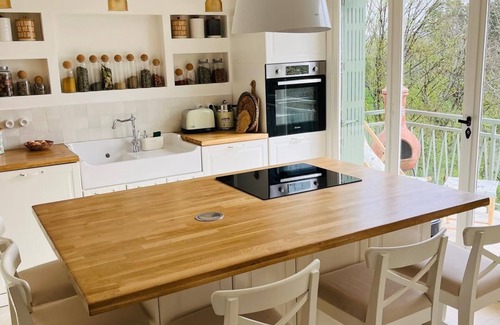 - Une cuisine ouverte sur l'espace salon/séjour, entièrement équipée avec de l'électroménager de qualité (lave vaisselle et plaque à induction, four, réfrigérateur congélateur, four à micro onde, hotte, bouilloire et grille pain, machine Nespresso),