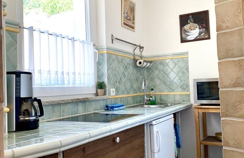 L'appartement confortable dispose d'une salle de séjour avec terrasse attenante, d'une chambre avec lit double, d'une cuisine pratique et d'une salle de bains moderne avec douche.