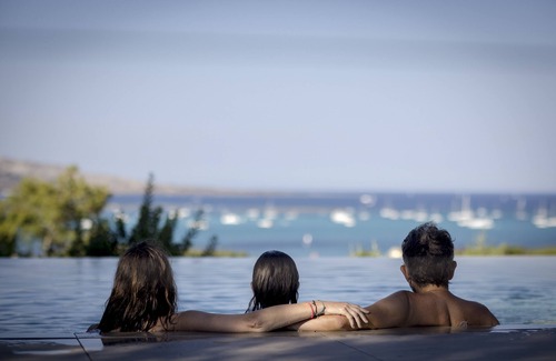 Villa privée de luxe avec piscine à débordement vers une vue imprenable sur la mer. Une chambre principale avec salle de bain en suite, deuxième chambre principale avec canapé 2 lits supplémentaires et salle de bain en suite, troisième chambre avec lit superposé.