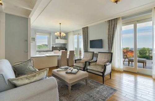 Refined three-room apartment in a villa dedicated to NAPOLEONE, elegant, evocative of the Empire style. Ground floor, 75 sqm, high quality finishes, accessible to disable. Equipped kitchen, sofa bed, two bedrooms, two bathrooms. TV, WI-FI connection, air conditioning. Patio and furnished panoramic terrace, carport in the basement. In the common area: washing machine and tumble dryer, iron. Possibility of breakfast in the room or in common area (Convivio). Access to communal garden and outdoor common pool.