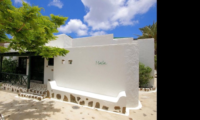 Villas Finca La Crucita spreads over a surface area of 7,500 square metres and is situated in the village of Haria, in the north of Lanzarote. Villas Finca La Crucita is surrounded by over 50 palm trees, the majority of which are over one hundred years old, and it is set in a valley in which thousands of these species. Villas Finca la Crucita with 2 bedrooms is equipped with 1 double King size bed,2 twins, 120 sq. villa, living room, 2 bathrooms, terrace, shared the outdoor pool with solar panels and **Pool heated in winter-time 01 October until 01. April**, Pre-paid air conditioning, free parking and free wifi in communal areas.