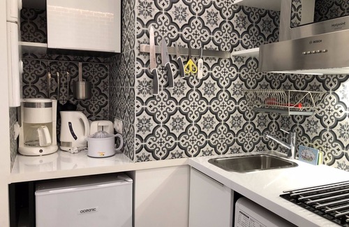 La cuisine américaine est entièrement équipée avec des équipements modernes, comprenant un réfrigérateur, un lave-linge, un micro-ondes, une bouilloire, un presse-agrumes et une collection complète de vaisselle et ustensiles de cuisine. Parfait pour préparer des repas rapides ou des collations pendant votre séjour.