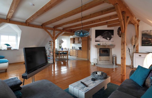 Passez les "plus beaux jours de l'année" dans votre appartement non fumeur de 80 m² lumineux et meublé avec goût situé dans les combles. Il dispose de 2 chambres séparées, d'un confortable salon-salle à manger ouvert avec cheminée et d'une cuisine intégrée (cuisinière électrique, micro-ondes, réfrigérateur, cafetière, bouilloire, mélangeur, cuiseur à œufs), salle de bains avec douche, lavabo et toilettes.