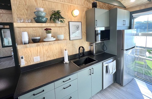 Within this welcoming 600 square foot cabin, you'll discover an inviting interior that exudes the essence of 'hygge'. Elevated ceilings and large windows make the space feel airy and bright, and help bring to focus the intended Scandinavian design inspirations: clean, simple lines, minimalism, and functionality without the sacrifice of beauty.