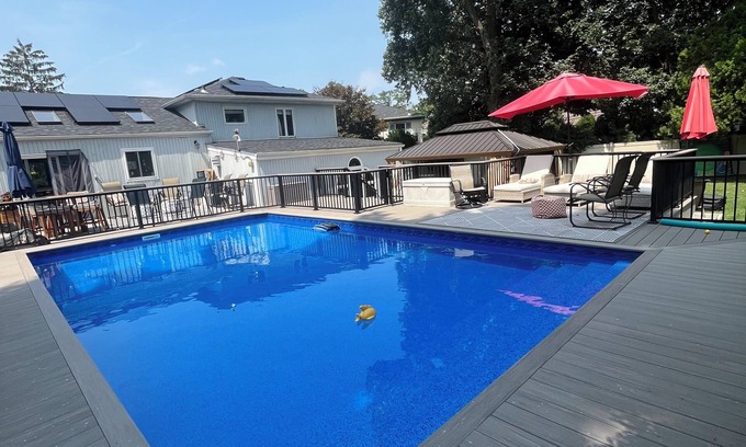 Our spacious home with a large backyard with lots of entertaining space and heated pool provides everything you need. Enjoy modern amenities, a fully equipped kitchen, large den, high-speed Wi-Fi, smart TVs, and comfortable sleeping arrangements for up to 6-8 guests. Relax after busy day with the indoor or outdoor living area or unwind in the pool. Our outdoor fridge and ice maker will ensure you will always have a cool drink on hand