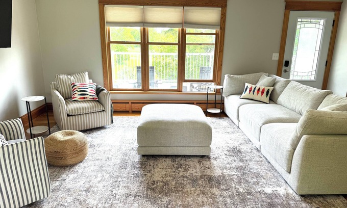 This Alexandria house boasts 3 inviting bedrooms and massive bunk room, including 3 king beds, 4 bunk beds with 4 twins and 4 double beds on bottom overlooking the 8th and 9th hole of the best family friendly golf course. With 3 bathrooms equipped with hair dryers and showers and tub, guests will feel right at home. The marvelous property offers WiFi, Smart TVs, two cozy living rooms, a washer and dryer, office space, massive yard for wiffle ball, pickleball, yard games, bonfires, excellent fishing off the dock, paddle boat,water trampoline, kayak, and more. You're sure to make fantastic memories with a stay at our place. Great for entertaining with large open concept kitchen space and seating for all. Our Lakehouse is perfect to host family get togethers big or small.
