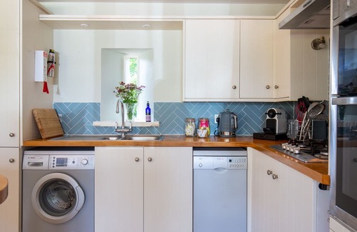 A stable door opens into this large, open-plan space. The tiled floor underfoot is warmed by underfloor heating, and the room is filled with light from two huge windows to one side and double doors to the outside. The central island with four high stools is a great spot to perch with a coffee or a glass of wine, or for a casual breakfast. There's also a dining table which seats four comfortably. The kitchen is exceptionally well equipped with an eye-level oven, electric hob, slimline dishwasher, washing machine and built-in fridge freezer. The handy cupboard under the stairs houses the tumble dryer and is where cleaning equipment and the high chairs are stored. If travelling with younger guests you'll also find plenty of child-friendly cups, crockery and cutlery, and there's a blender too. It's a great, sociable space that is ideal for families.