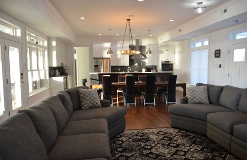 En entrant dans la maison, vous êtes accueilli dans une grande chambre spacieuse avec une vue imprenable sur le lac. Deux canapés surdimensionnés peuvent facilement accueillir une douzaine d'invités, qui peuvent profiter d'une conversation avec les cuisiniers dans la cuisine gastronomique voisine ou regarder un film sur la télévision 60 ". La grande salle ouverte se jette dans la salle à manger, qui peut accueillir confortablement un groupe de 12 personnes, et dans la cuisine de la péninsule avec son îlot et son bar de près de 13 pieds. Les chefs apprécieront le four à double flexion Samsung, la table de cuisson à induction à cinq brûleurs KitchenAid et le tiroir à micro-ondes Sharp. Deux réfrigérateurs de grande taille, dont un Samsung de luxe dans la cuisine, un centre de boissons et une machine à glaçons industrielle, facilitent le stockage des boissons et des aliments pour les grandes fêtes, et deux éviers et deux lave-vaisselle facilitent le nettoyage.