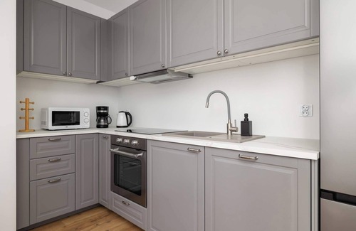 This functional and efficiently arranged apartment of 41 m² is an ideal choice for a family with children or a group of friends looking for a comfortable place to stay in Kraków. Upon entering the apartment, guests find themselves in a cozy hallway from which all rooms are accessible. The heart of the apartment is an elegant living room with a kitchenette, which serves as a perfect place to spend time together. The living room features a comfortable double sofa that offers relaxation after an eventful day and also functions as a sleeping place for two people, as well as a 40-inch Smart TV with cable access. It’s an ideal spot for evening movie sessions or board games with loved ones. The apartment is equipped with remote-controlled air conditioning that provides pleasant coolness on hot days, ensuring a comfortable sleep and rest. The kitchenette is designed with cooking enthusiasts in mind. It is equipped with modern appliances such as an oven, dishwasher, induction cooktop, microwave, fridge with freezer, electric kettle, and drip coffee maker. Everything needed to prepare homemade meals is here. Next to the kitchenette, there is a dining table where the whole group can enjoy their meals together. The apartment also includes a separate bedroom, offering a quiet retreat after a busy day. It features a comfortable king-size bed that guarantees a peaceful and restorative sleep for two people. The bathroom is equipped with a shower, washing machine, and hairdryer, which will certainly be appreciated by guests planning a longer stay. The entire interior is maintained in a bright, modern style, creating a spacious and pleasant atmosphere. An additional asset of the apartment is a balcony accessible from the living room. It is a perfect place for morning coffee or evening relaxation with a view of the surrounding greenery and modern housing estate. The balcony is furnished to allow comfortable outdoor leisure time. Practical amenities such as a standing clothes dryer, vacuum cleaner, iron, and ironing board are also available in the apartment, making the stay even more comfortable and hassle-free. For guests with vehicles, an underground garage parking space is provided, ensuring the safety of the car and convenience. Moreover, the apartment is pet-friendly for an additional fee. For guest safety, the apartment is equipped with a carbon monoxide detector.